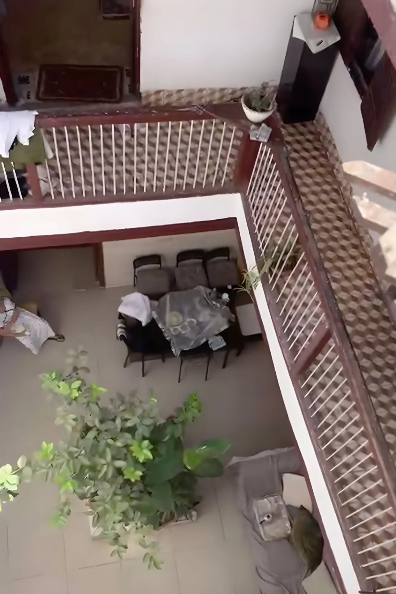 Intimiste et chaleureux, le bien s'organise autour d'un patio ouvert baigné de lumière, agrémenté de plantes et d'un espace salon-salle à manger en plein air. Les galeries en bois et les carreaux de ciment d'époque confèrent au lieu un charme authentique immédiat. Les plafonds en poutres de bois apparentes, visibles depuis les galeries du premier étage, apportent cachet et caractère à l'ensemble.